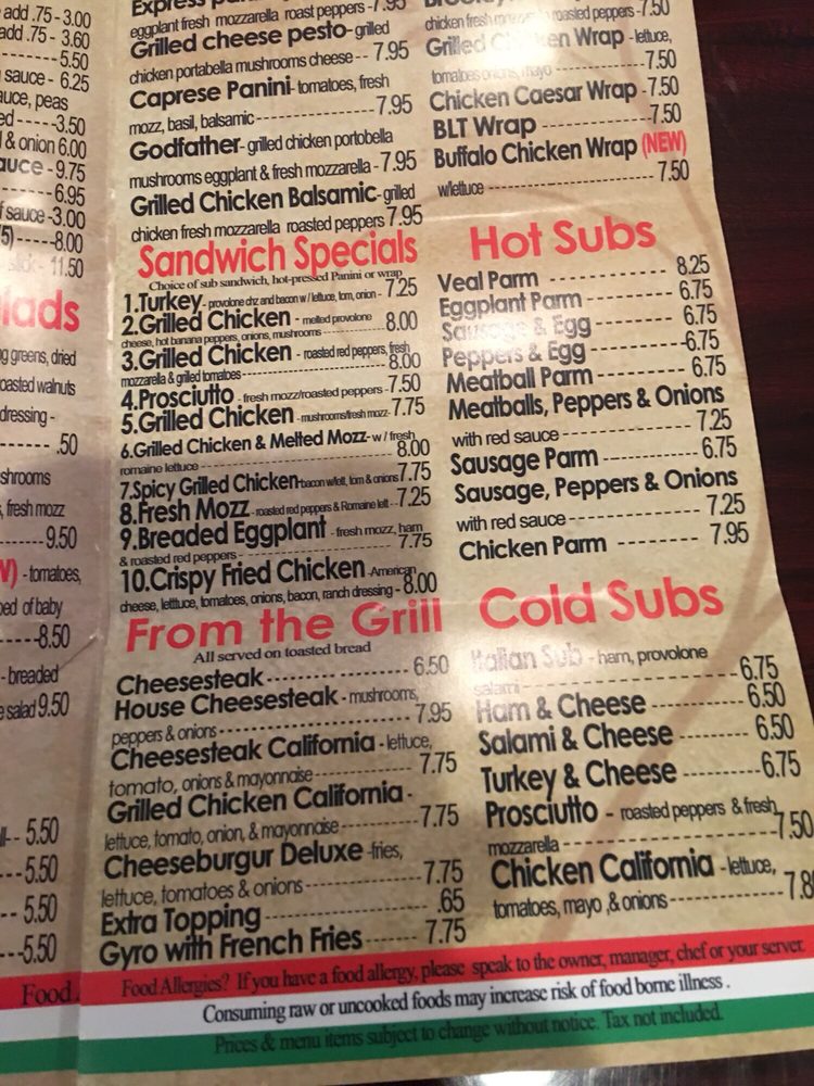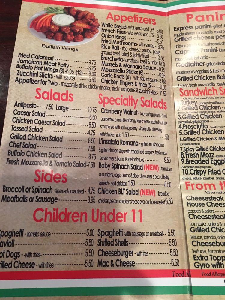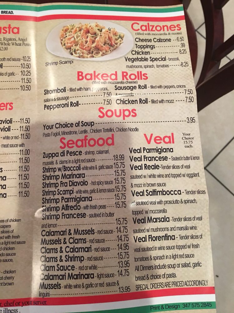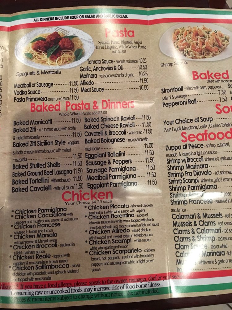 Shrimp parmigiana over choice of pasta: angel hair to whole wheat penne. Dressing options from blue cheese to raspberry vinegar.